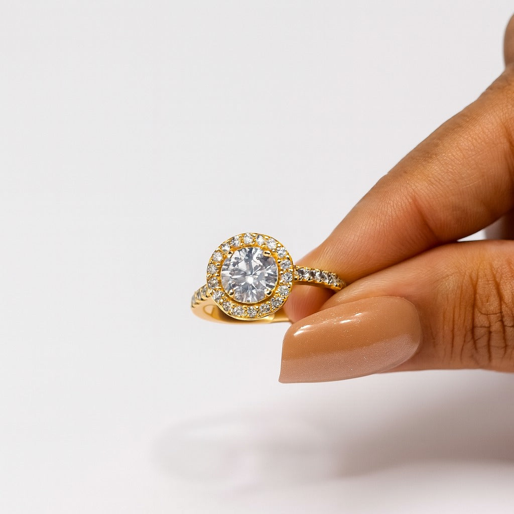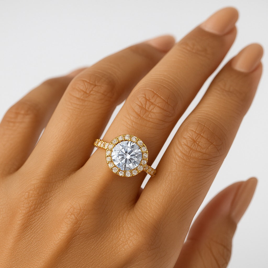 Discover timeless radiance with the Aura Brilliant Halo ring, where luxury meets everyday elegance. This stunning piece showcases a captivating central gemstone surrounded by a shimmering pave halo that amplifies its brilliance. The meticulously crafted band features continuous sparkle, creating an enchanting play of light from every angle. Crafted in premium gold vermeil, this ring combines durability with sophisticated style, making it an ideal choice for those seeking a statement piece that transcends trends. Whether for a special occasion or as a cherished everyday treasure, this ring delivers the glamour and refinement you deserve.