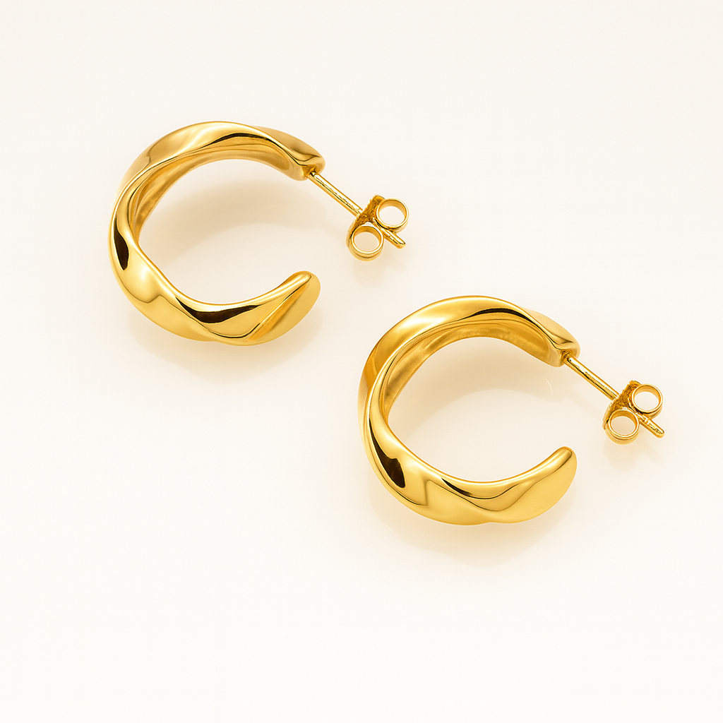 Elevate your everyday look with the Midas Twist Studs, a unique take on the classic gold hoop. These premium, minimalist earrings feature a captivating twisted design that catches the light from every angle, creating a dynamic, rippled effect. They are the perfect blend of modern sophistication and timeless luxury.